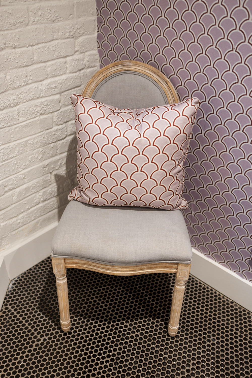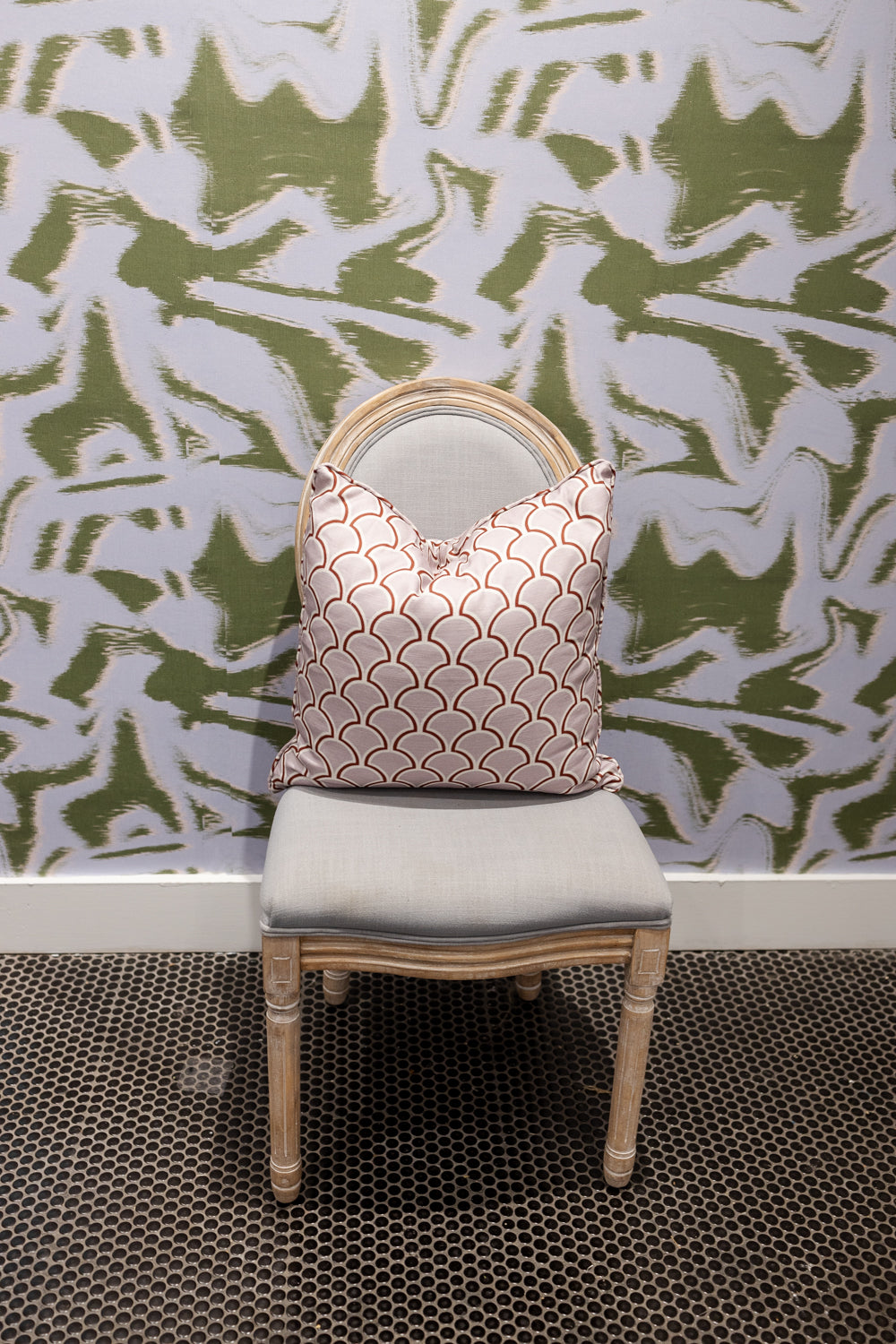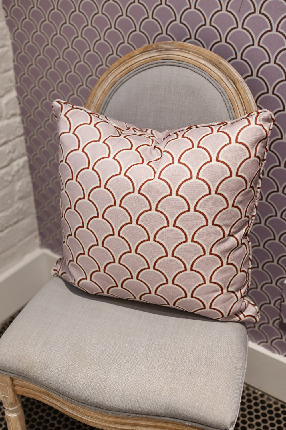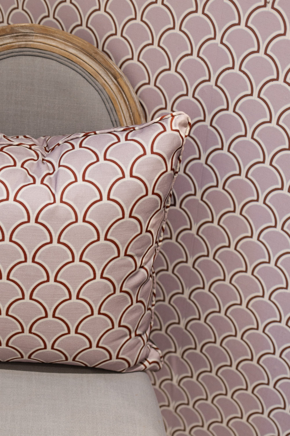 THE SARAH print is a classic geometric scallop repeat with three complimenting trims. The mauve has a burgundy, cream, and very subtle blue.